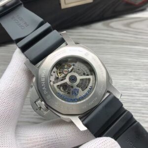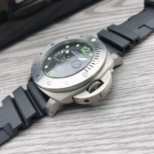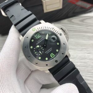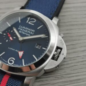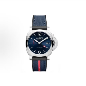 White with luminous hour markers and dots. Date at 3 o’clock, small seconds at 9 o’clock