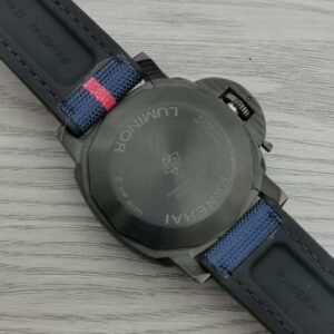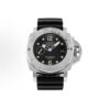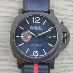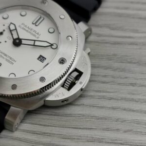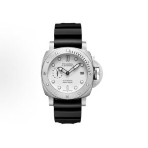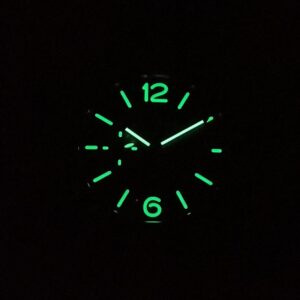 White with luminous hour markers and dots. Date at 3 o’clock, small seconds at 9 o’clock